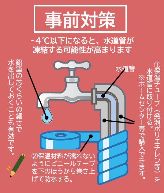 - 特に気温が−4℃以下になると、水道管が凍結する可能性が高まりますので、ご注意ください。