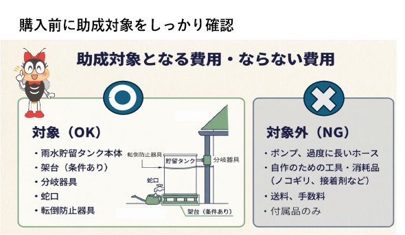 助成対象は雨水貯留タンク等が機能するために必要な最小限の設備(タンク・架台・分岐器具・蛇口・転倒防止器具)であり、過大な設備、製作工具や消耗品、他の目的に転用できる部品などは対象外です。また、付属品のみの助成はできません。