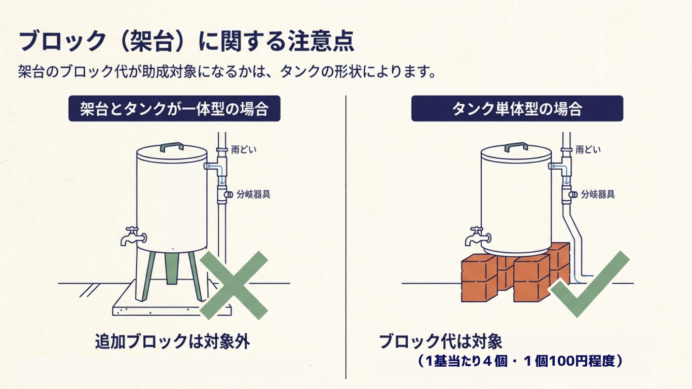2 雨水貯留タンク単体型については、架台のブロックは助成対象です。(100円程度のブロック4個まで)