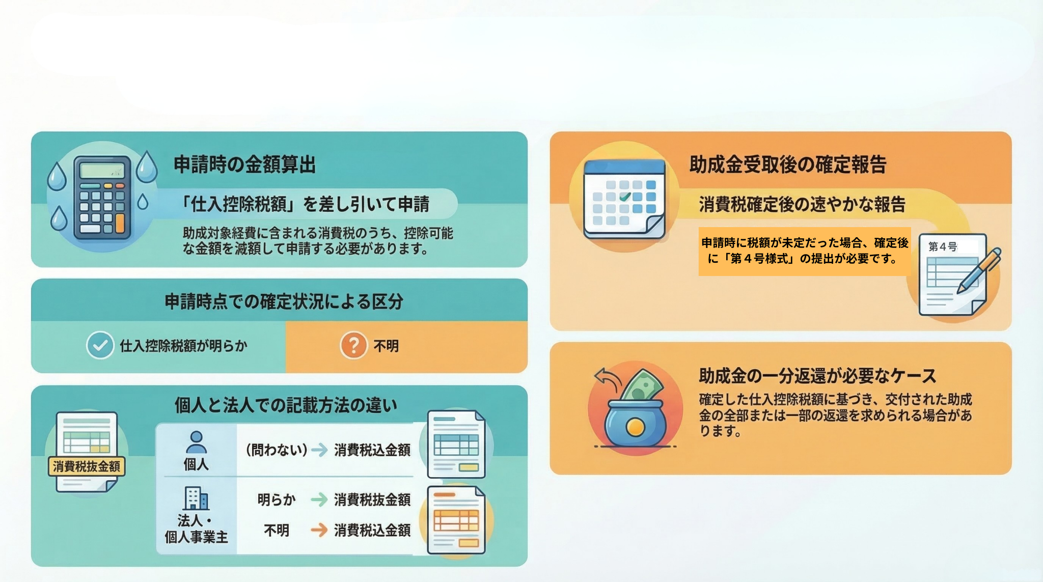 ※個人事業主又は法人の申請者の方は、法人等を選択のうえ、当該助成金に係る消費税及び地方消費税に係る仕入控除税額が明らかな場合は【消費税抜】金額、明らかでない場合は【消費税込】金額で申請してください。