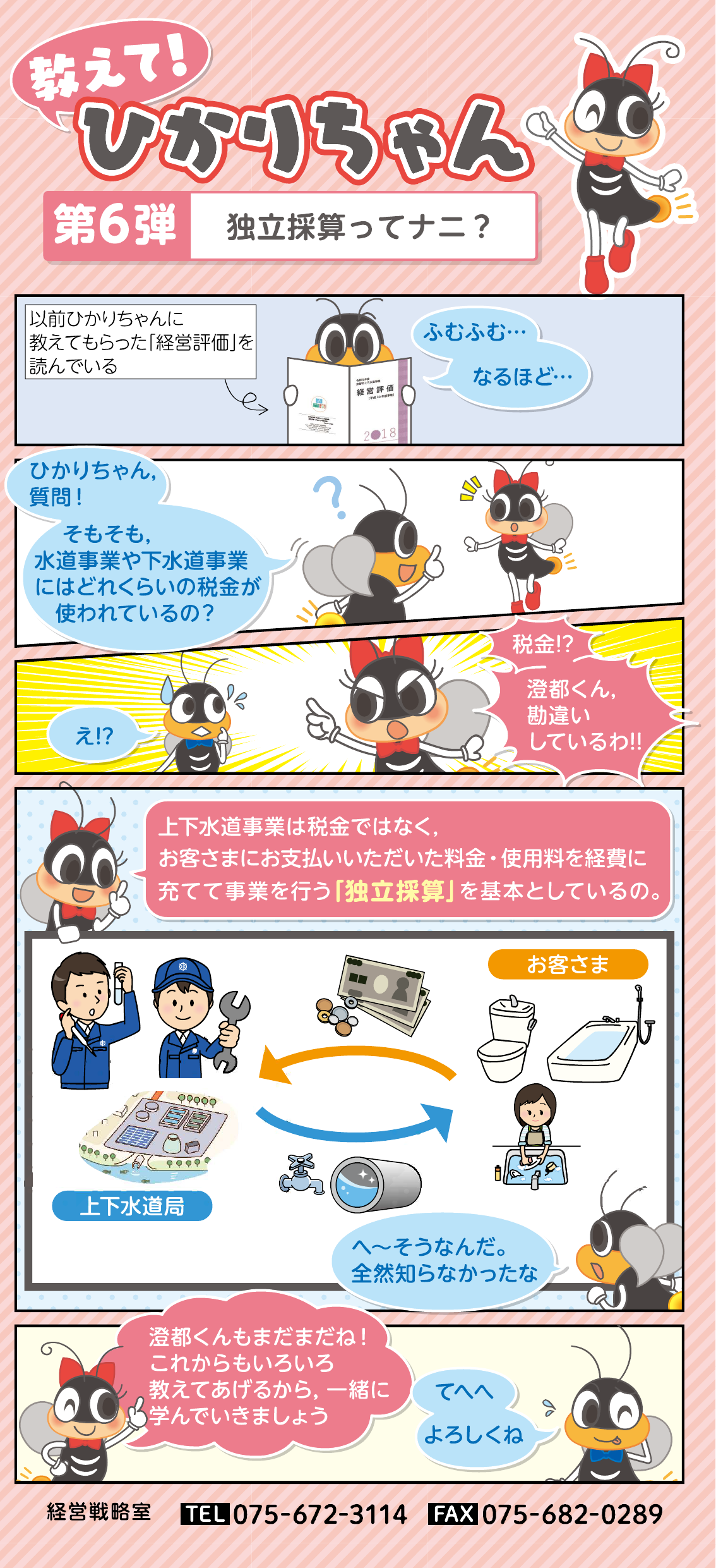 - 市民の皆さまに本市水道事業・公共下水道事業の個々の事業や経営状況について御理解いただくために、経営情報をわかりやすく説明するコラム「教えて!ひかりちゃん」を作成しています。