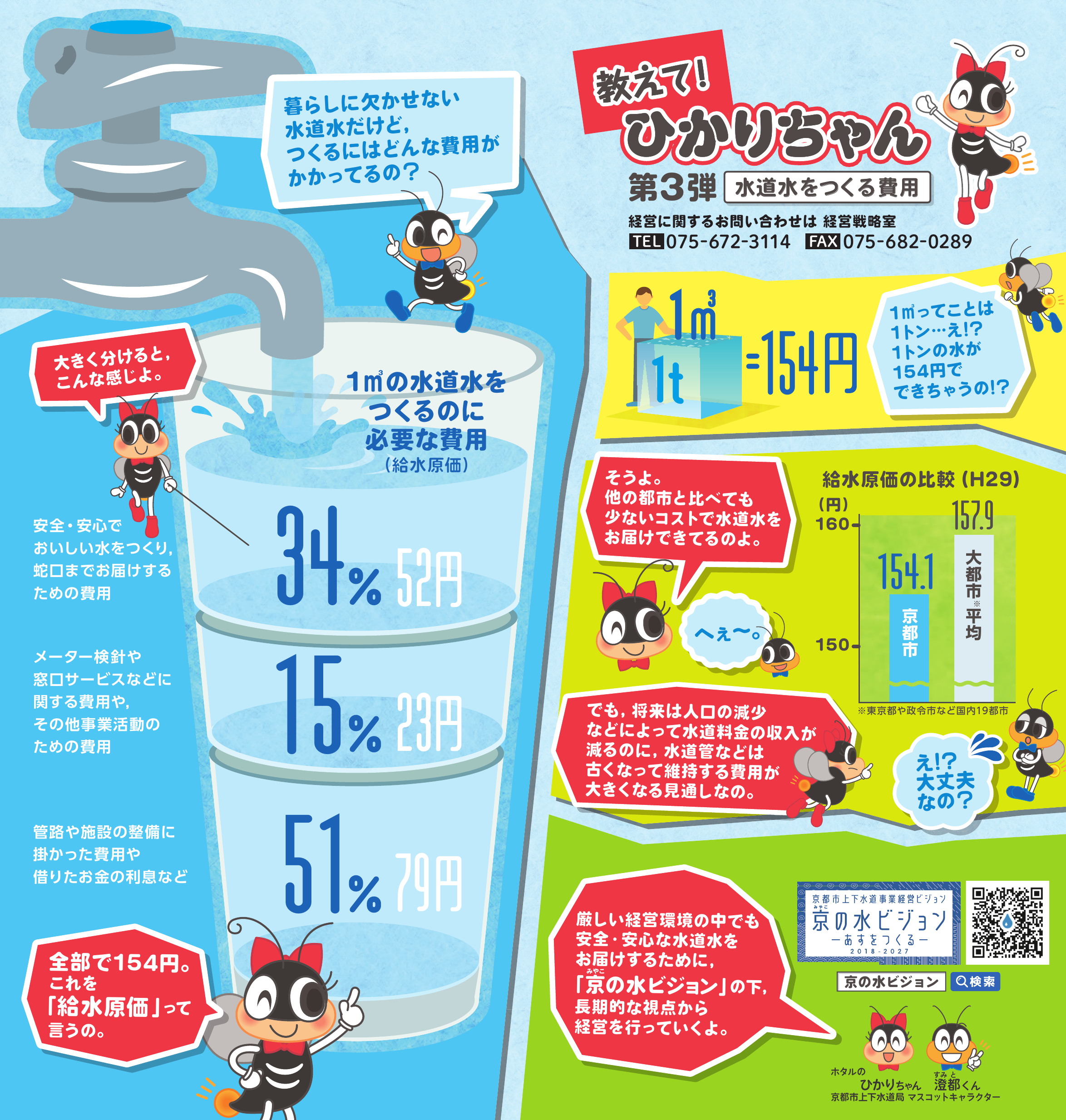 - これらは、水道メーターの検針時に「水道使用水量のお知らせ票」と併せて配布している事業PRリーフレット(京の水だよりmini)に掲載されている内容と同じものです。