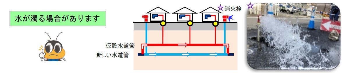 - 給水管をつなぎ替える際には,一時的に断水が発生します(約1~2時間)。 ※事前にビラを投函し,施工業者がお声掛けします。