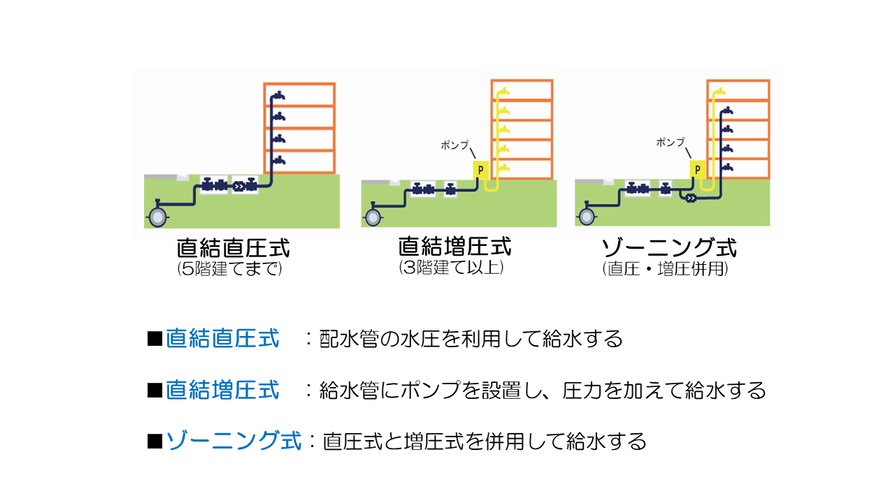 ただし、受水槽式給水から直結式給水への切替えには、水圧など一定の条件を満たす必要があります。