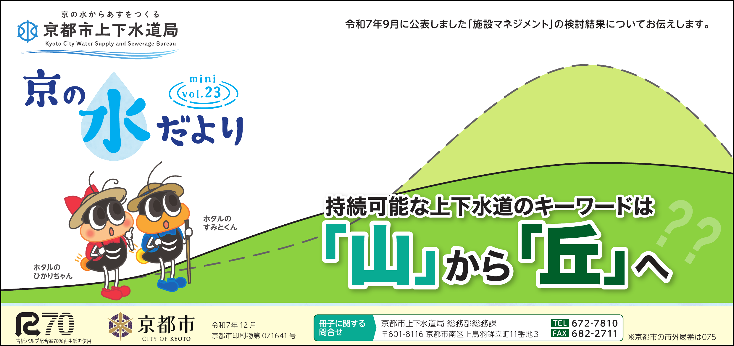 - これらは、水道・下水道をご使用いただいているお客さまへ、検針時に各戸に配布している事業PRリーフレット(京の水だよりmini)に掲載に掲載されている内容と同じものです。