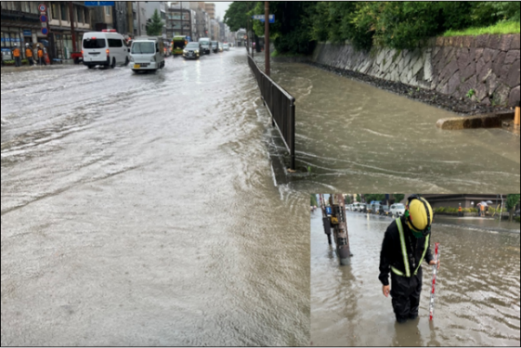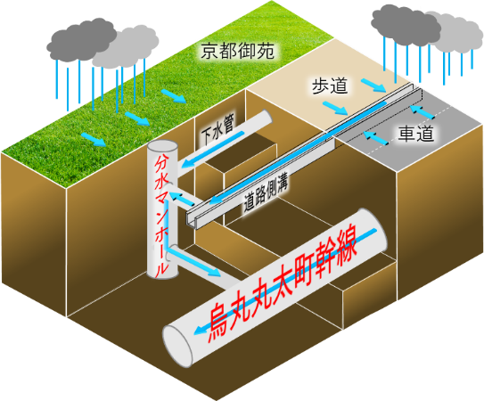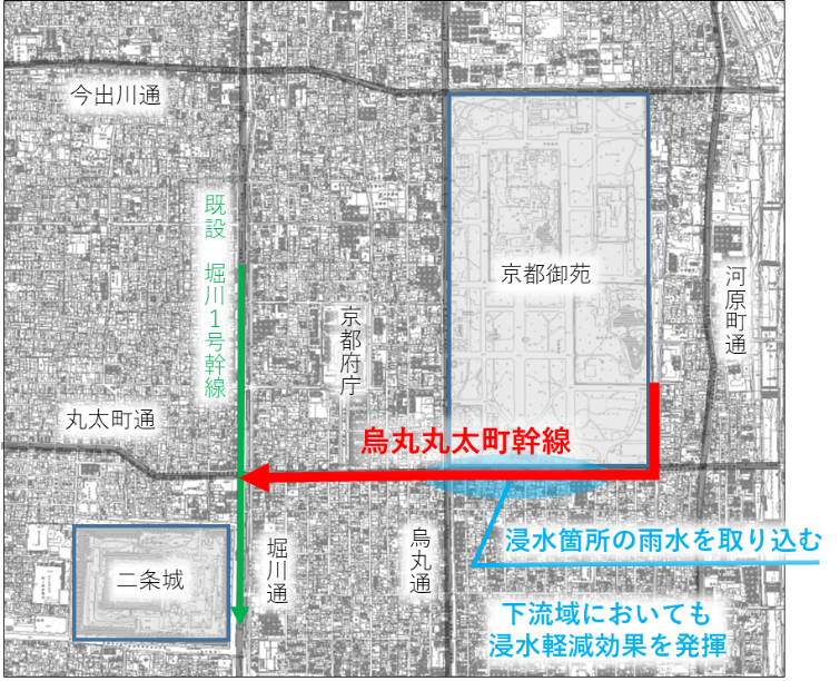 烏丸丸太町交差点及びその東側を含む地域では、度々浸水被害が発生していたため、令和2年度から「烏丸丸太町幹線」の整備に着手しました。大雨時に雨水を幹線に取り込むことにより、浸水被害を大幅に軽減することができます。