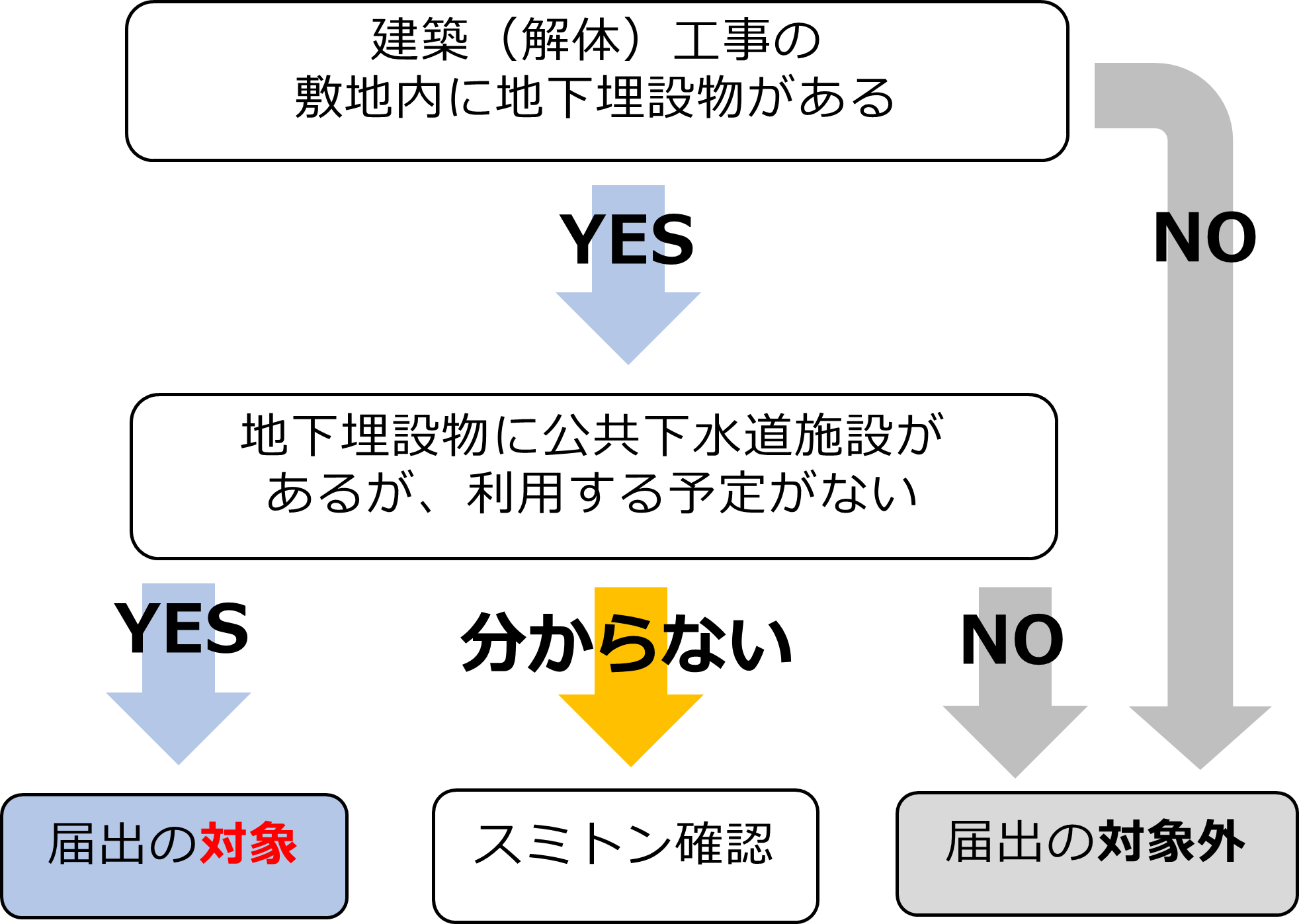以下のフローにしたがって、行われる工事が上下水道局への届出・申請を必要とするかご確認をお願いします。