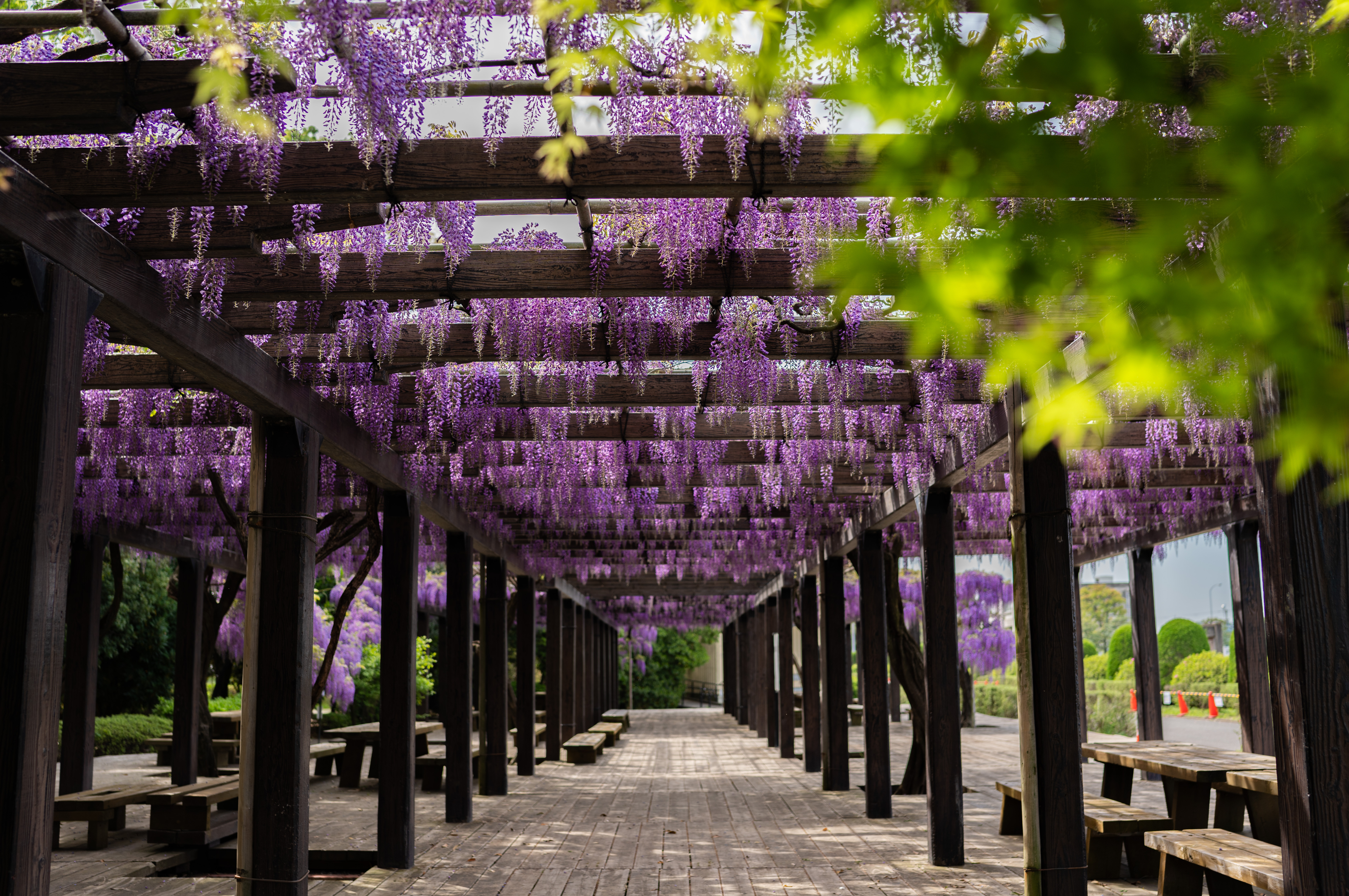 「鳥羽の藤」の鳥羽水環境保全センターには、3種類のフジが約40本植えられており、藤棚の全長は120m、面積は約1,000㎡に及びます。