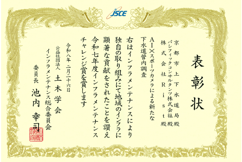 令和8年2月26日に、公益財団法人土木学会主催の「インフラメンテナンス・シンポジウム」において、「第5回インフラメンテナンス賞」の表彰式が開催され、「AI×スポーツカメラによる新たな下水道管内調査」に関する取組が「インフラメンテナンス チャレンジ賞」を受賞しました。