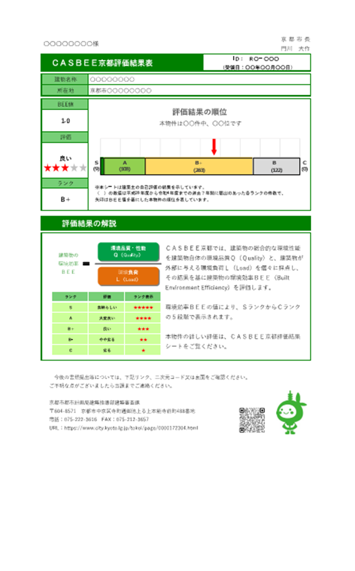 届出いただいた「建築物排出量削減計画書」をもとに、CASBEE京都評価結果表を交付いたします。
