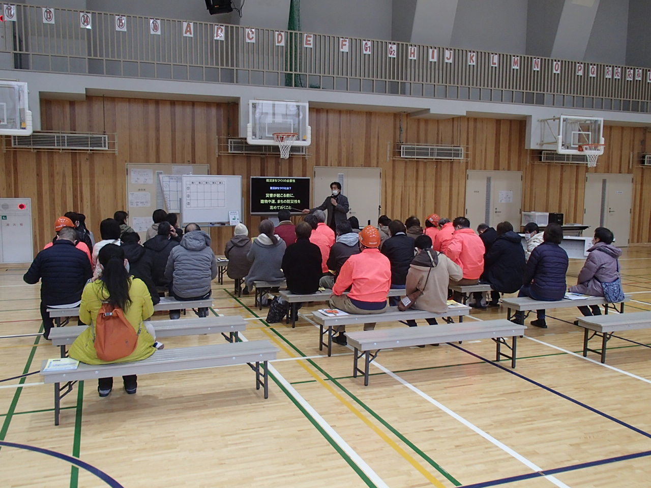 これまで実施した防災まちづくりの取組を紹介するとともに、旗上げクイズによって防災まちづくり計画の内容について周知を行いました。