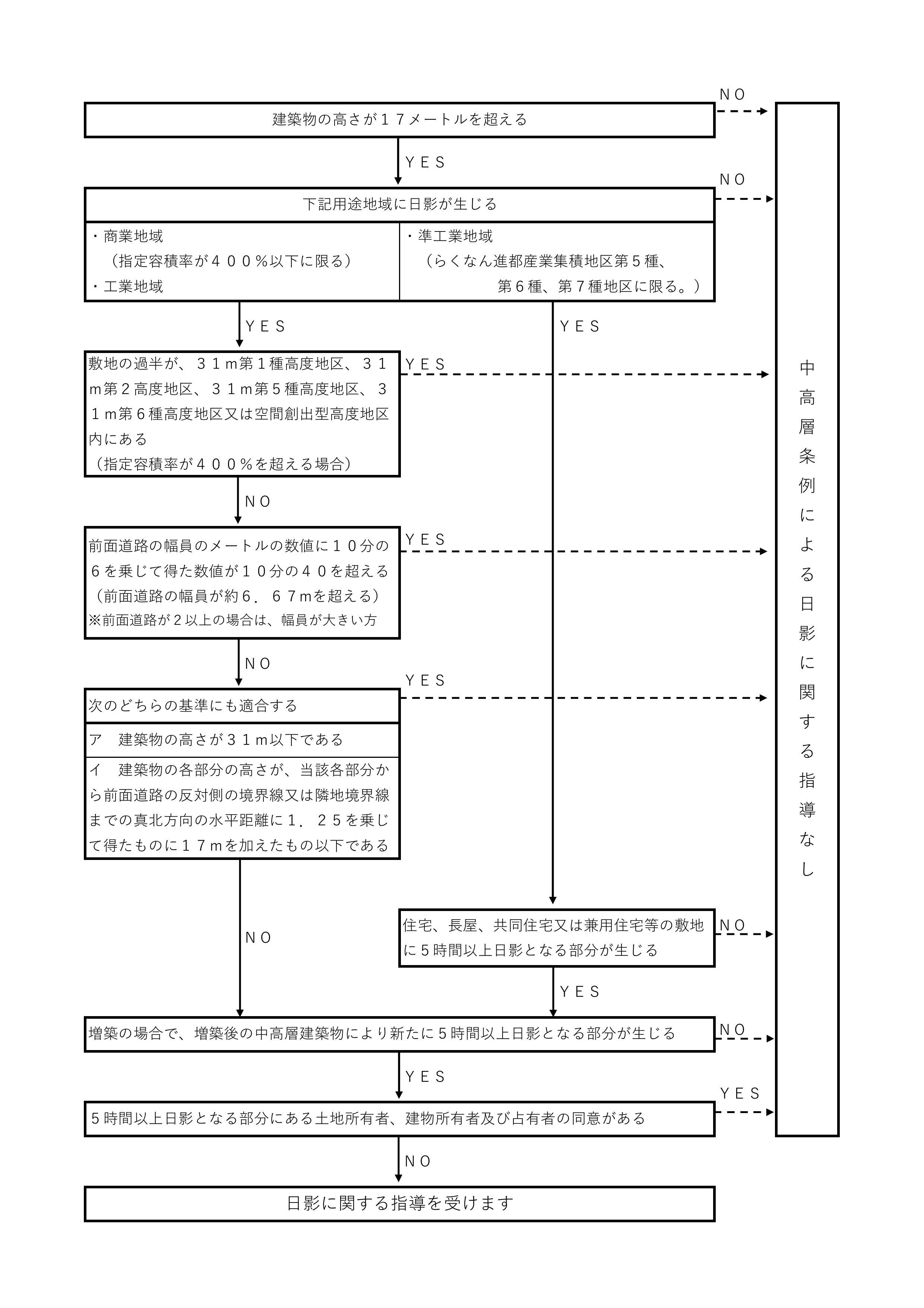 中高層条例では、商業地域、工業地域及び準工業地域(一部)において、一定規模を超える建築物に対して、住環境保全のため、日影に関する指導を行っています。