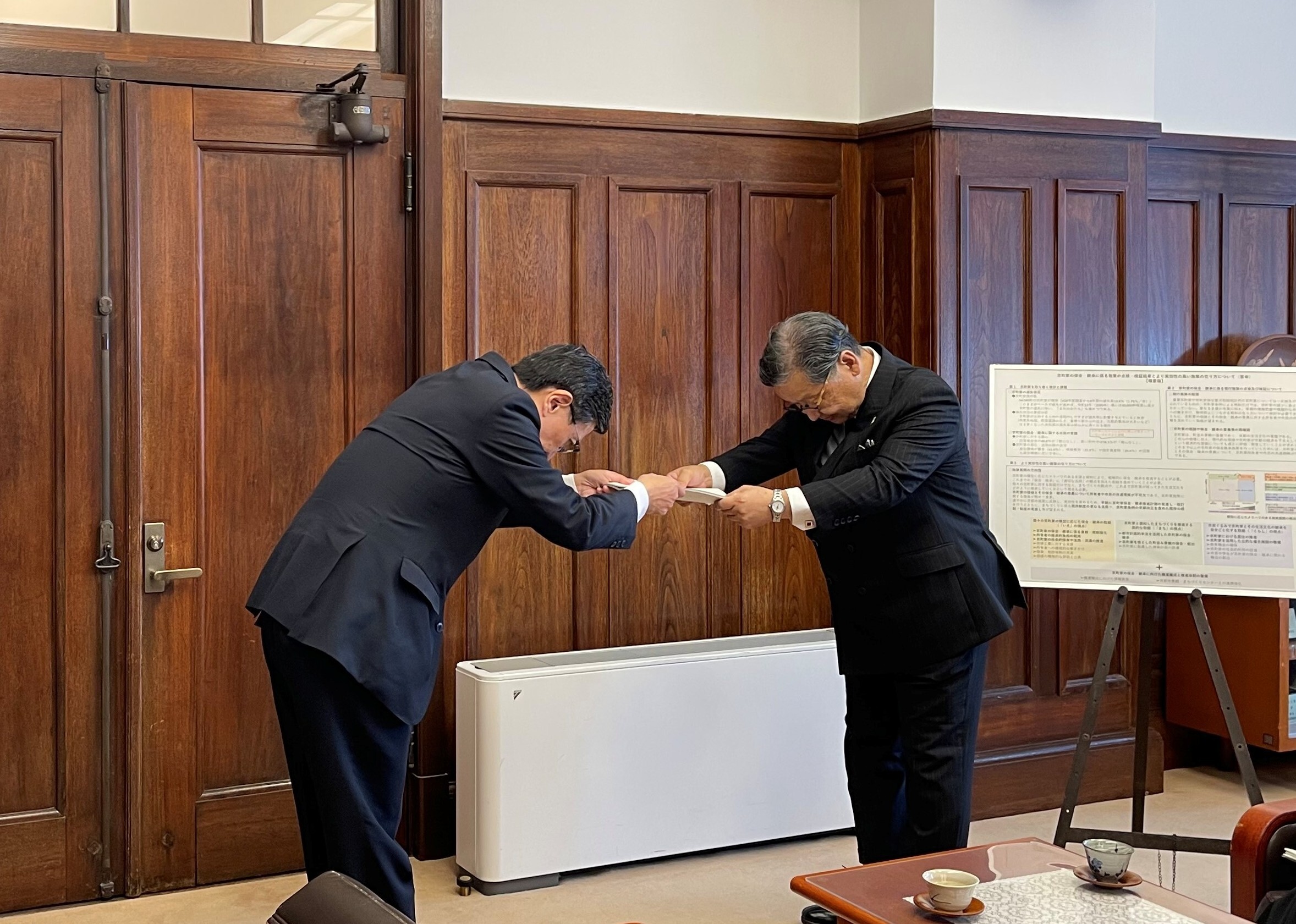 京都市京町家保全・継承審議会から市長に対し、「京町家の保全・継承に係る施策の点検・検証結果とより実効性の高い施策の在り方について」の答申書が提出されました。