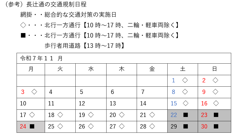 なお、歩行者用道路規制の実施日(令和7年11月22日(土曜日)、23日(日曜日・祝日)、24日(月曜日・振休)、29日(土曜日)、30日(日曜日))は、迂回運行等が実施されますので、御注意願います。