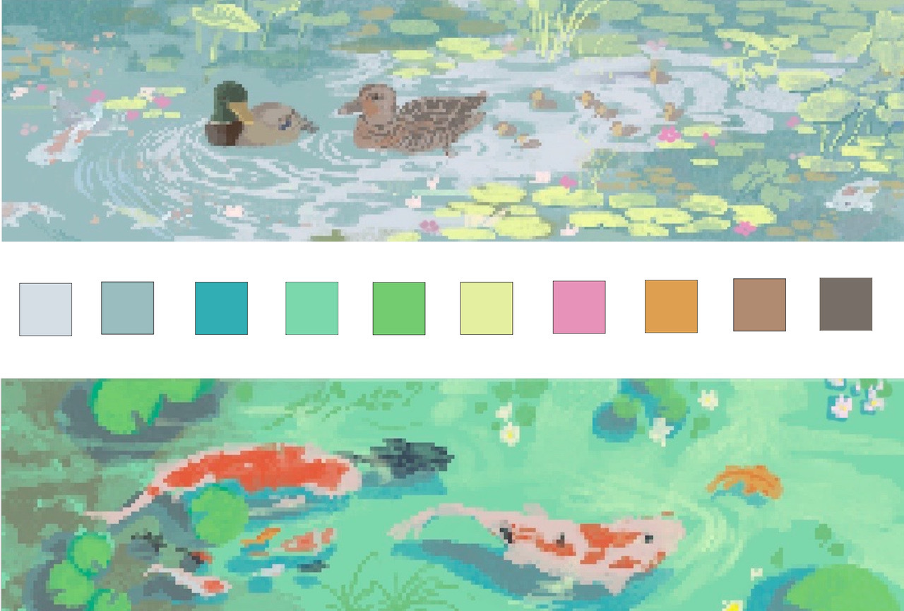 鴨川を始めとした京都にある水辺の自然をモチーフにした作品です。イラストをドット化することで、水辺の淡くおぼろげなイメージを表現しています。