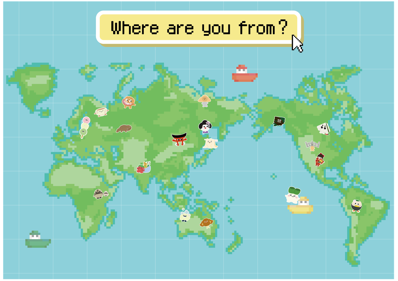 「どこからきて、どこへいくのか」をテーマに、様々な場所から来られた方々が、自身の行き来する場所を壁の地図にシールで示す参加型の展示です。