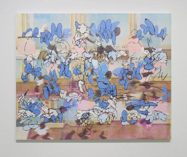 主に複数枚の画像から線や形をトレースし、シルクスクリーンの技術を用いて、イメージの拡大や複製、編集を繰り返し、画面の再構成をしている。