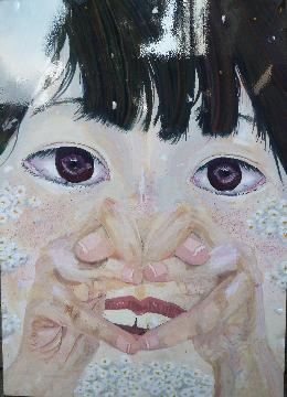 不思議な絵である。そして心に細く残る絵である。画面からはみ出すように大きく描かれた顔,つややかね髪の毛,じっとこちらを見つめる眼,軽く空けられた口,どれをとっても写実的にしかも克明に描かれている。しかし,それだけではない。際立つものはなんと言っても印相を結ばれたような手の表現である。さらに瞳に映り込んだ口。作者自身の様々なおもいや経験をもとに「いくじなし」を比喩や象徴で表現しようとしているかのようである。