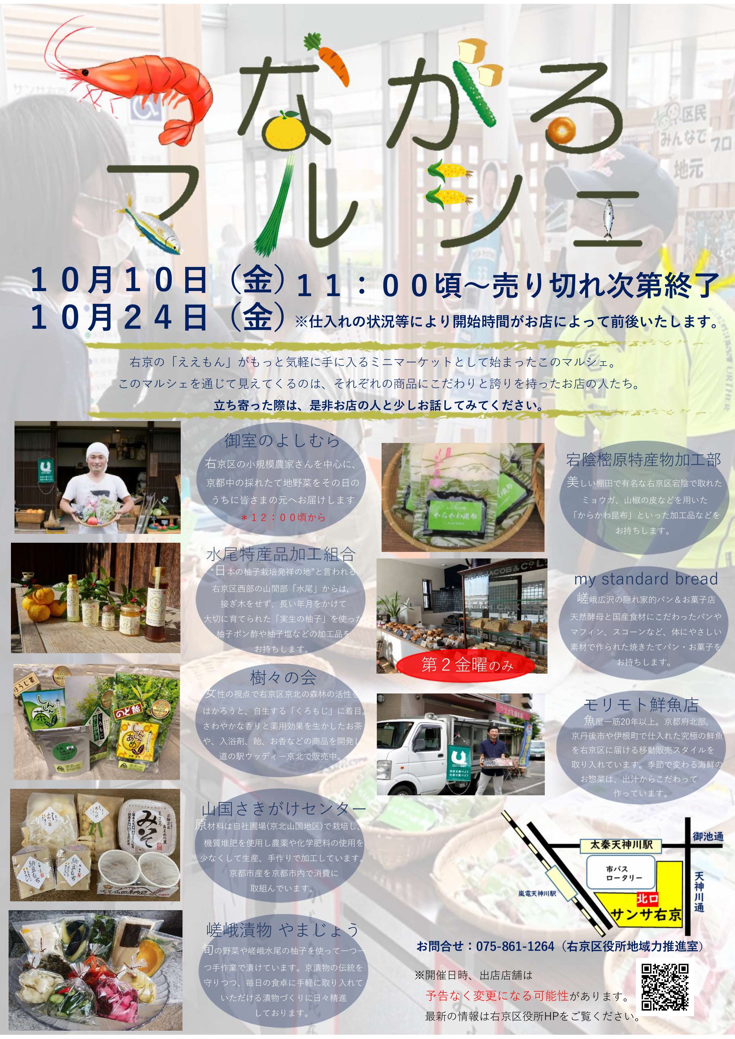 水尾特産品加工組合、宕陰樒原特産物加工部、モリモト鮮魚店、my standard bread、御室のよしむら、樹々の会、山国さきがけセンター、嵯峨漬物やまじょう