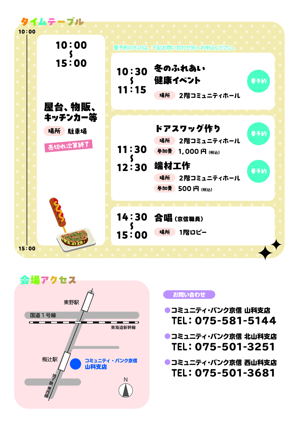 山科にある京都信用金庫3店舗合同で、地域に活力と人のつながりを創出し、山科の魅力向上につなげる目的でイベントを開催します。
