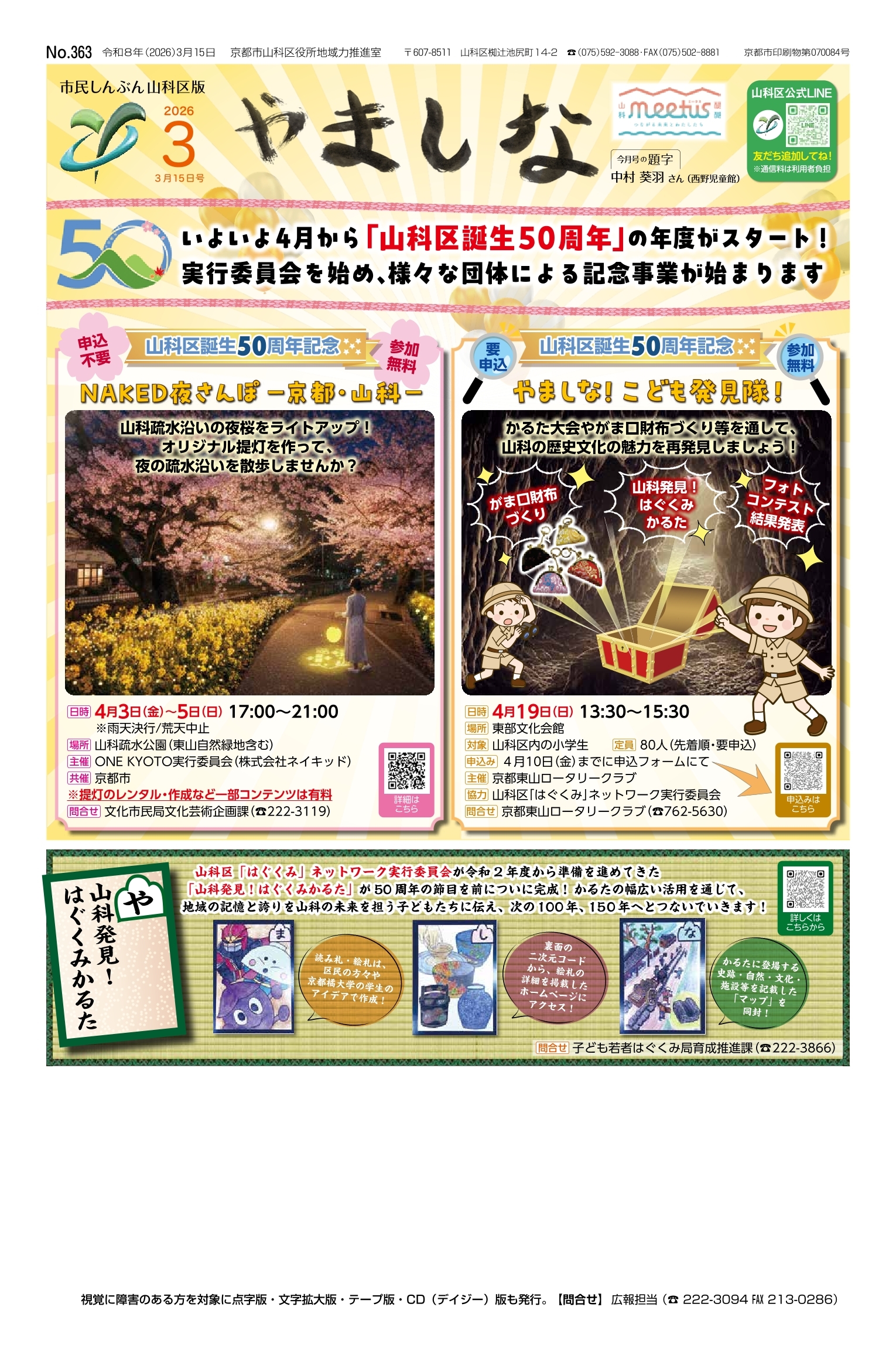 市民しんぶん山科区版令和8年3月15日号1面「山科区誕生50周年記念 やましな!こども発見隊!」の内容の一部が変更になりましたので、訂正いたします。